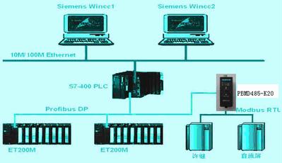 在本自动控制系统中,将西门子S7-400 PLC作PROFIBUS主站,ET 200M和PBMD-K20网关作PROFIBUS从站。另一方面,在Modbus总线中将PBMD-K20网关作Modbus主站,继电保护装置和直流屏设备作为Modbus的从站,双方以9600bps的通讯速率进行通讯。具体的网络结构如图1所示: