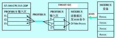 其中,I1..I3是PROFIBUS主站分配给这个MODBUS模块的PROFIBUS输入地址I1~I3,对应本MODBUS报文读到的24 bits (0xxxx)。这样,PLC在进行编程时,直接读取I1~I3即可得到MODBUS 的24个输出线圈0xxxx的状态。