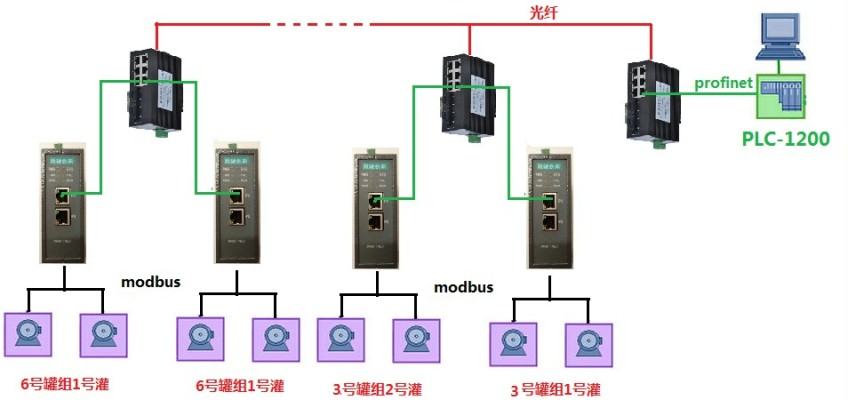 1.案例简介:本案例现场在天津市燃料油公司,该公司拥有15万吨储油设施, 本案应用于3~6号罐组。每个罐组有6~12个不等的油罐,每个油罐有两个电动阀门控制油罐的进油和出油。电动阀门采用的是modbus的通讯协议,PLC使用的是西门子1200系列PLC,现场采用PROFINET工业以太网通讯,通过modbus转profinet网关转换。由于油罐与控制室距离较远,所以现场采用微硬创新生产的WYS208/2F两光六电光纤以太网交换机。本案例的目的是在中控室控制油罐的进油、出油的开关以及电动阀门的位置等操作。
