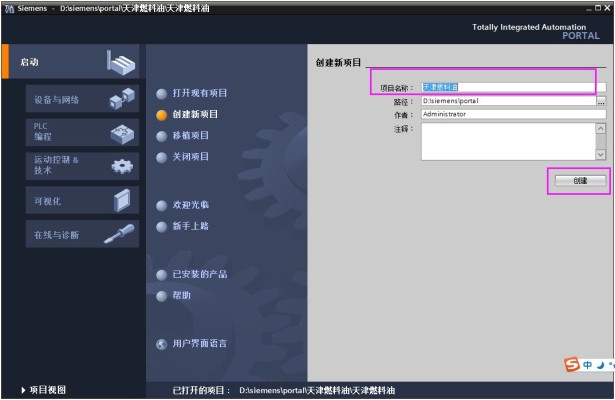 “TIA Portal V13 ”创建新项目—>输入项目名称—>创建。图3-1: