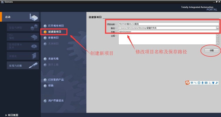 “TIA Portal V13 ”创建新项目— 输入项目名称,选取项目保存路径,然后选择“创建”按钮,建立新项目,图4-1: