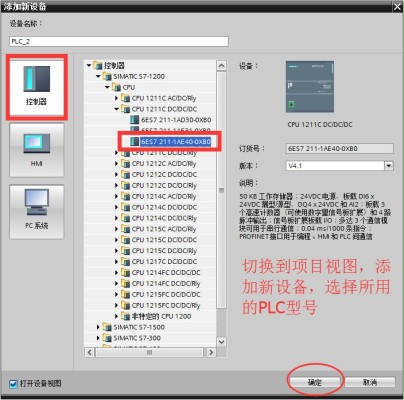 (2)点击添加新设备,本例选取的是西门子PLC1200,如图4-2:选取所应用的PLC型号,点击“确认”,进入硬件组态界面。