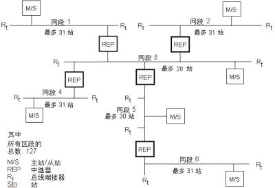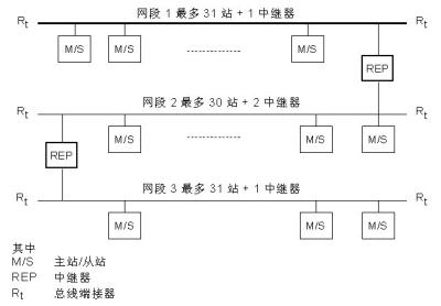 下图详细说明了PROFIBUS中继器的用法,如有疑问,致电公司技术支持部。